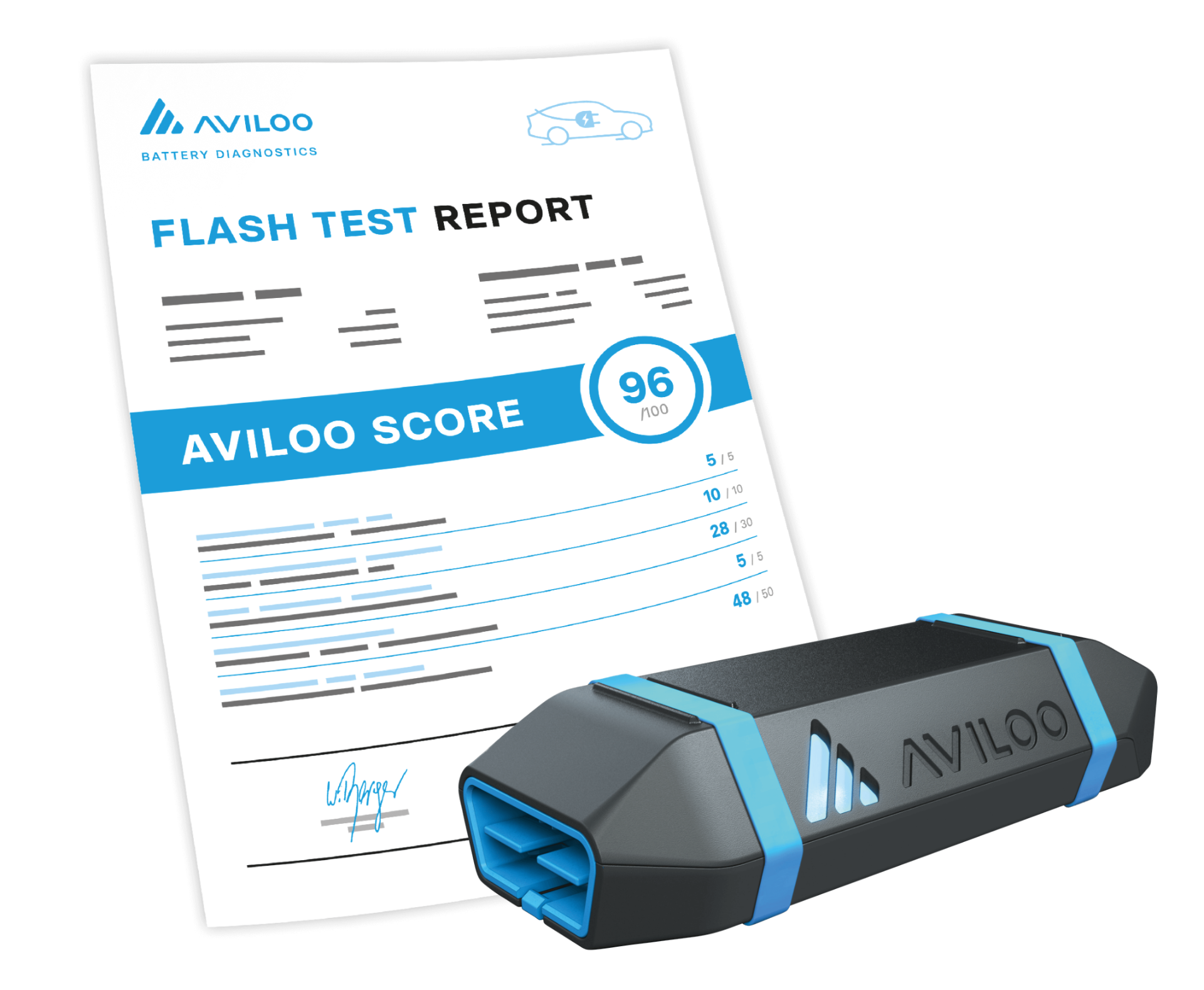Výsledkem FLASH Testu je AVILOO Score, které kombinuje aktuální měřené hodnoty s historickými daty, jako je celková spotřeba energie, počet nabíjecích cyklů a jízdní chování. Tento skóre poskytuje nezávislé hodnocení stavu baterie a pomáhá identifikovat potenciální problémy. Pokud test odhalí významné odchylky nebo potenciální závady, generuje se zpráva s označením "Red Flag", která upozorňuje na konkrétní problém. Tento přístup umožňuje efektivní hodnocení stavu baterie i bez nutnosti jízdy, což je ideální pro situace, kdy vozidlo nelze řídit do vybití baterie, například při vracení leasingového vozu.